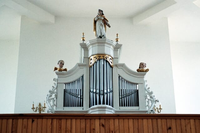 Stół gry wbudowany w prawy bok szafy. Pozytyw o 7 głosach i zakresie klawiatury CFDGEABHc-c3.