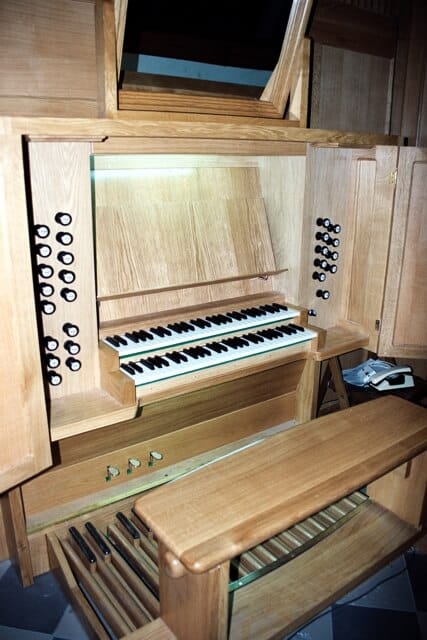 | Manuał I Bourdon 16’ Pryncypał 8’ Flet otwarty 8’ Gamba 8’ Oktawa 4’ Szpicflet 4’ Kwinta 2 2/3’ Superoktawa 2’ Mikstura 4x Trompet | Manuał II Gemshorn 8’ Flet kryty 8’ Pryncypał 8’ Rurflet 8’ Nasard 2 2/3’ Picolo 2’ Tercja 1 3/5’ Szarf 3x Krumhorn 8’ | Pedał Pryncypał 16’ Subbas 16’ Oktawbas 8’ Fletbas 8’ Chorał 4’ Puzon 16’ |