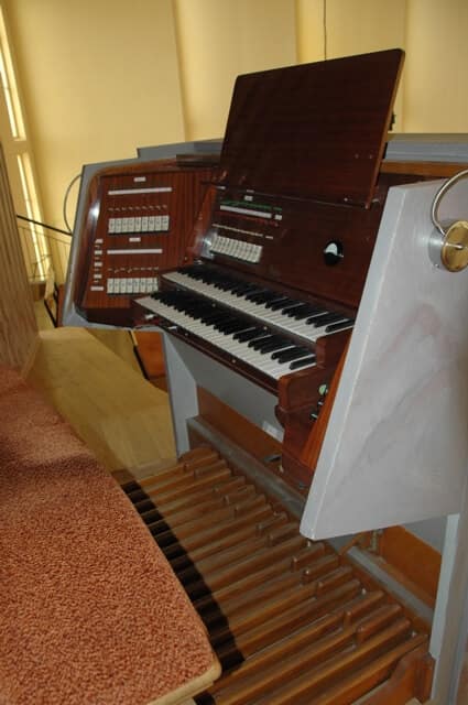 Stół gry wolnostojący, na osi prospektu, przodem do ołtarza głównego. 27 głosów podzielonych pomiędzy dwa manuały (9+10) o zakresie C-g3 i pedał (8) o zakresie C-f1.