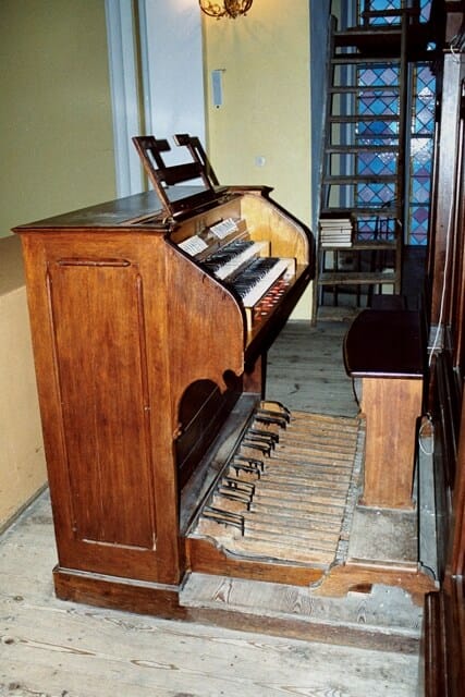 | Manuał I Pryncypał 8” Holflet 8” Gamba 8” Oktawa 4” Flet 4” Mixtura 2” | Manuał II Gedekt 8” Salicet 8” Aeolina 8” Vox Celest. 8” Fugara 4” | Pedał Subbas 16” Cello 8” Fletbas 8” |