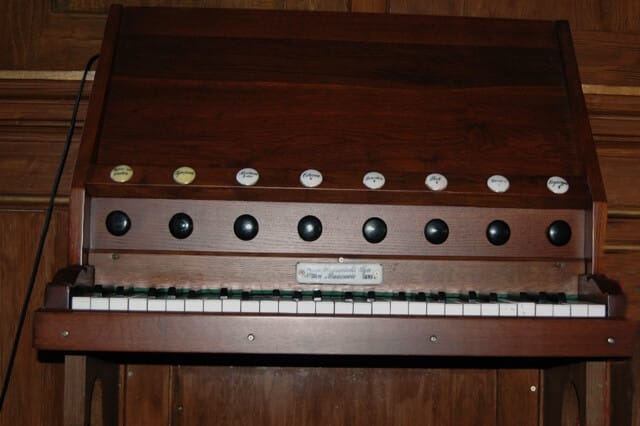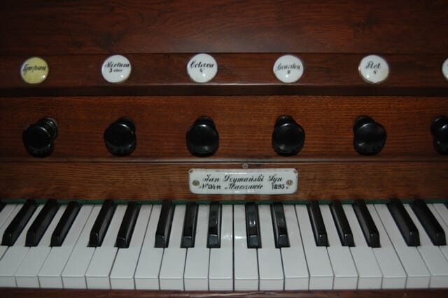 Stół gry wbudowany w lewy bok szafy organowej. Pozytyw o 6 głosach i zakresie klawiatury C-c3.