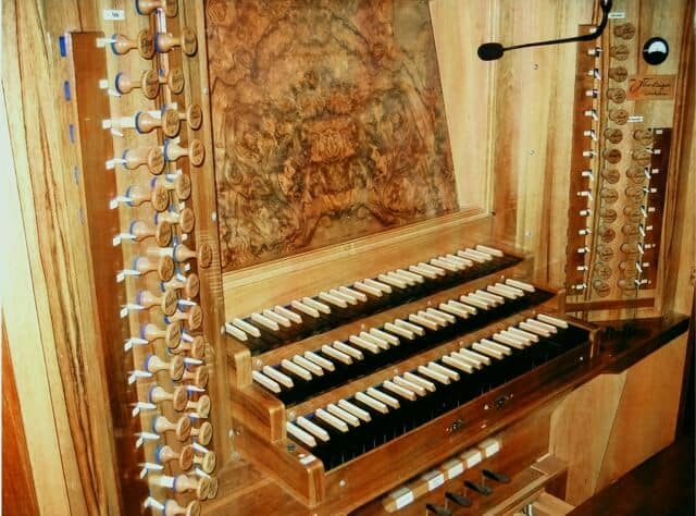 Stół gry wbudowany centralnie w cokół głównej szafy organowej, tyłem do ołtarza głównego. 45 głosów podzielonych pomiędzy trzy manuały (8+13+13) o zakresie C-g3 i pedał (11) o zakresie C-f1.