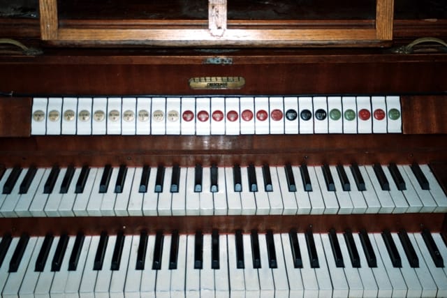 Urządzenia pomocnicze: Połączenia II/I, I/P, II/P, Subokt. II/I, Super II/I, Crescendo, Szafa ekspresyjna, Tremolo Flet 4’, Tremolo Gedekt 8’.