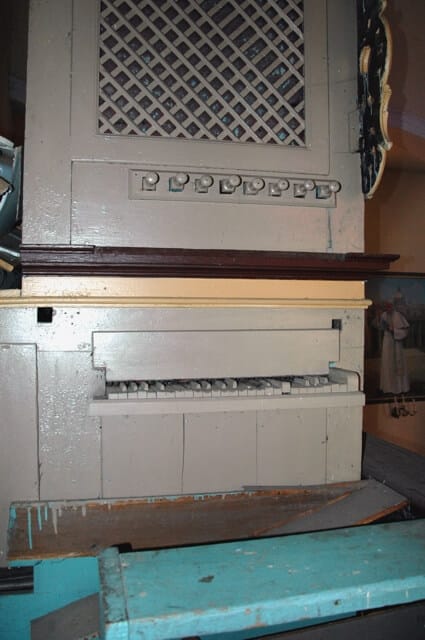Stół gry wbudowany w lewą boczną ścianę szafy organowej, bokiem ołtarza. Pozytyw o 8 głosach. Klawiatura o zakresie CFDGEABHc-c3.