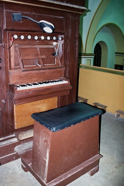 Stół gry wbudowany w lewą ściankę szafy organowej, bokiem do ołtarza głównego.