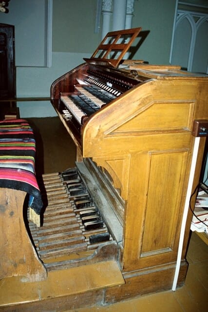 Stół gry wolnostojący, po lewej stronie chóru, bokiem do ołtarza głównego. 18 głosów podzielonych pomiędzy dwa manuały (9+5) o zakresie C-f3 i pedał (4) o zakresie C-d1.