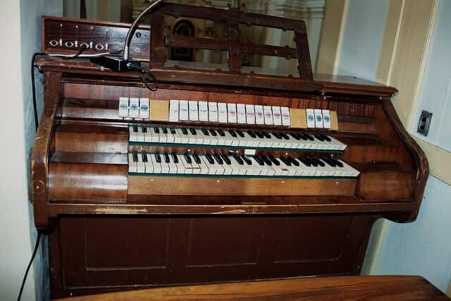 | Manuał I Bourdon 16’ – głos usunięty* Principał 8’ Viola di Gamba 8’ Salicional 8’ Flet Próżny 8’ Flet Rurkowy 4’ Octawe 4’ Progresion 2 2/3’ – głos usunięty* Mixtura 2 2/3’ | Manuał II Principał 8’ Łagodny reyestr 8’ Aeolina 8’ Voix Celeste 8’ Flet ukośny 4’ Violina 4’ – głos usunięty* | Pedał Subbas 16’ Violonbas 16’ – głos usunięty* Oktawbas 8’ Cello 8’ * głosy wykazane w karcie ODZ z 1981 roku. |