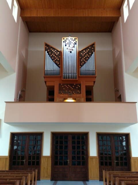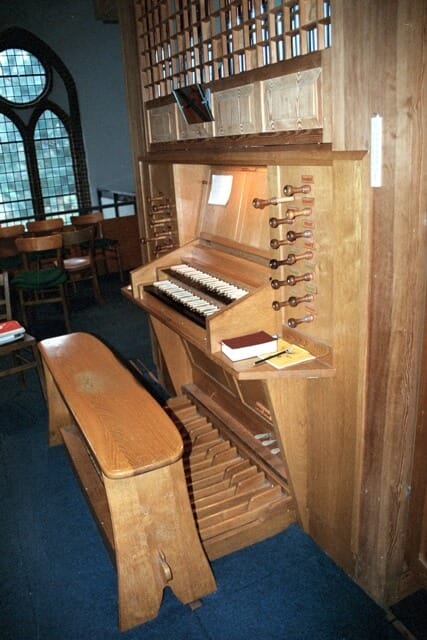 | Hauptwerk (I) Pommer 16’ Prinzipal 8’ Hohlflöte 8’ Oktave 4’ Traversflöte 4’ Gemshorn 2’ Rauschpfeife 2 fach Mixtur 4-6 fach Trompete 8’ | Brustwerk (II) Gedackt 8’ Flöte 4’ Oktave 2’ Waldflöte 2’ Spitzquinte 1 1/3’ Zimbel 3 fach Krummhorn 8’ | Pedal Subbass 16’ Oktavbass 8’ Choralbass 4’ Nachthorn 2’ Posaune 16’ |
