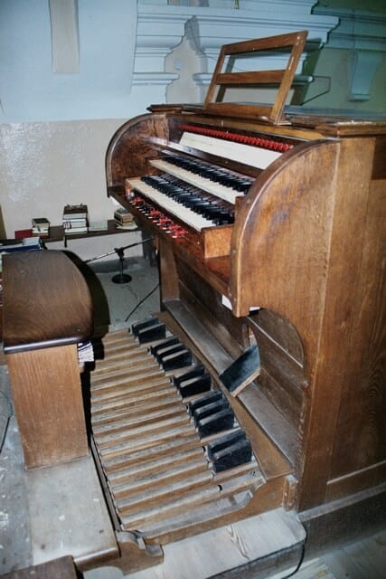 Stół gry wolnostojący, na osi prospektu, przodem do ołtarza głównego. 19 głosów podzielonych pomiędzy dwa manuały (7, 8) o zakresie C-a3 i pedał (4) o zakresie C-f1.