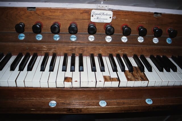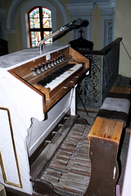 Organy wybudowane w 1908 roku przez Leopolda Hartmana w Warszawie, o czym informuje tabliczka nad klawiaturami.