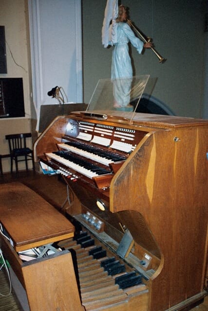 Dwa miechy pływakowe umieszczone w cokole szafy organowej, zasilane dmuchawą elektryczną.