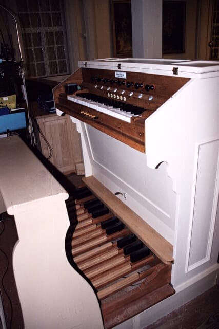 Stół gry wolnostojący, na osi prospektu, przodem do ołtarza głównego. 8 głosów podzielonych pomiędzy jeden manuał (6) o zakresie C-f3 i pedał (2) o zakresie C-c1.