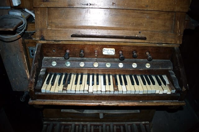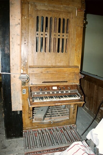 Stół gry wbudowany w lewą ścianę szafy organowej. 6 głosów podzielonych pomiędzy jeden manuał (5) o zakresie C-f3 i pedał (1) o zakresie C-h.