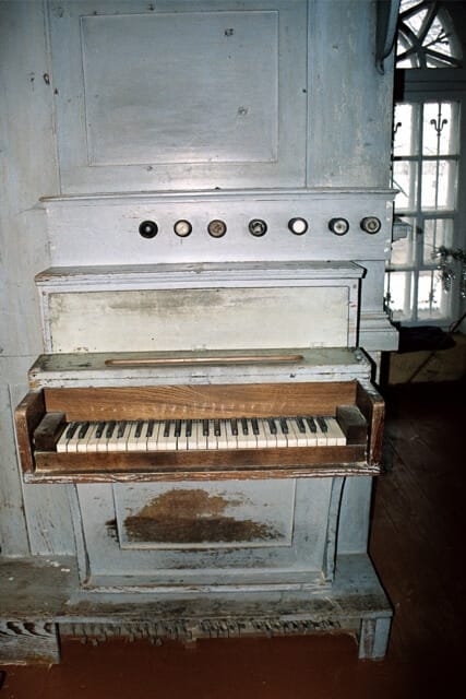 Stół gry wmontowany w lewy bok szafy organowej. 7 głosów podzielonych pomiędzy jeden manuał (6) o zakresie C-c3 i pedał (1) o zakresie C-c1.