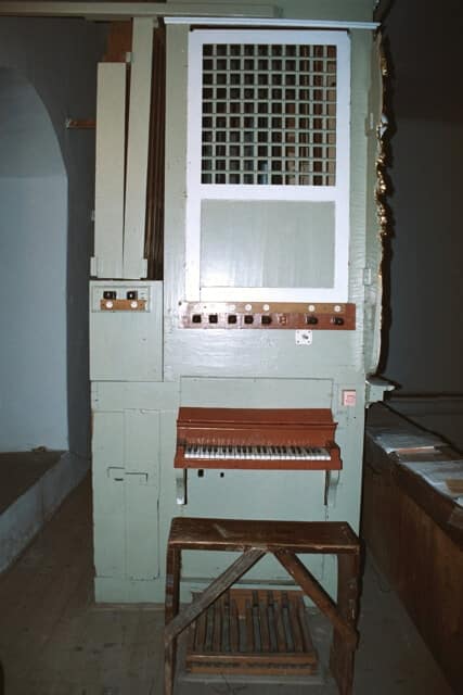 Stół gry wmontowany w lewą boczną ścianę szafy organowej. 9 głosów podzielonych pomiędzy jeden manuał (8) o zakresie C-c3 i pedał (2) o zakresie C-H.