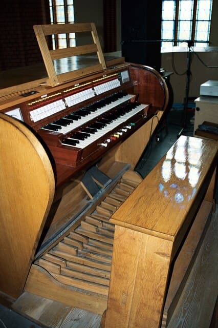 Stół gry wolnostojący, na osi prospektu, przodem do ołtarza głównego. 30 głosów podzielonych pomiędzy dwa manuały (I-10, II-12) o zakresie C-a3 i pedał (8) o zakresie C-f1.