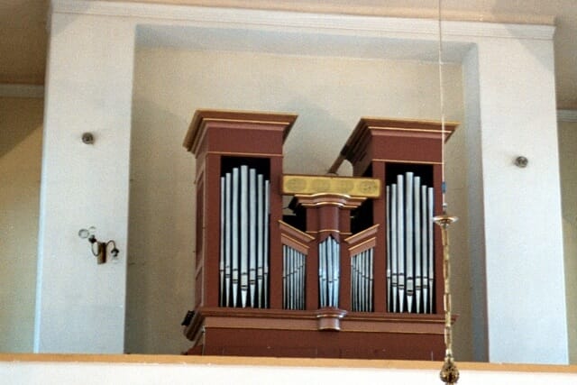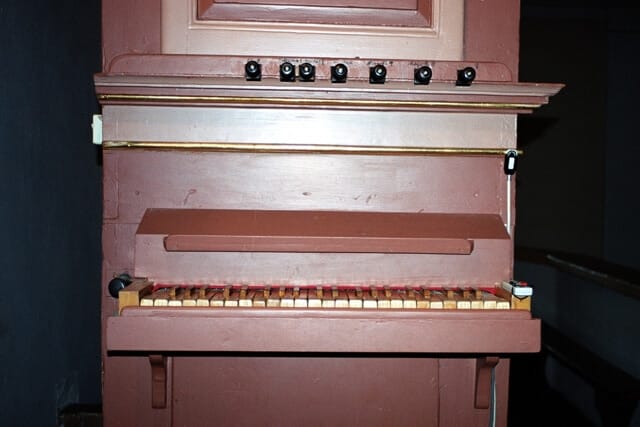 Stół gry wbudowany w lewy bok szafy organowej. Pozytyw o 7 głosach. Zakres klawiatury E-c3 (krótka oktawa przestawiona).