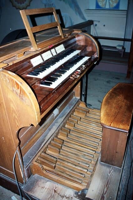 Miech pływakowy na zewnątrz szafy organowej.