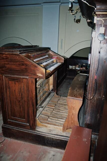 Stół gry obecnie wolnostojący, na osi prospektu, przodem do ołtarza głównego. Do 1935 roku, był wbudowany w lewy bok szafy organowej. 14 głosów podzielonych pomiędzy dwa manuały (I-6, II-4) o zakresie C-d3 i pedał (4) o zakresie C-d1.
