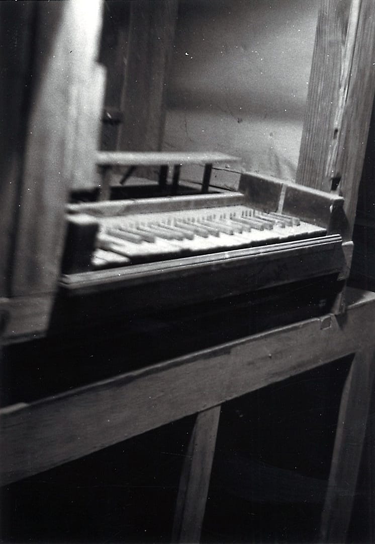 Klawiatura o zakresie CDEFGABH-c3 wbudowana w tył szafy organowej.