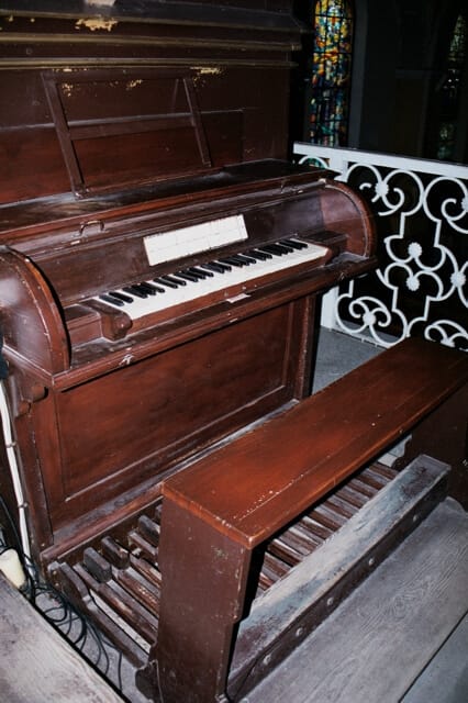 Stół gry wbudowany w lewą ściankę szafy organowej, bokiem do ołtarza głównego. 12 głosów podzielonych pomiędzy jeden manuał (9) o zakresie C-f3 i pedał (3) o zakresie C-d1.