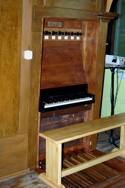 Stół gry wmontowany w lewy bok szafy organowej. 12 głosów podzielonych pomiędzy jeden manuał (9) o zakresie C-d3 i pedał (3) o zakresie C-c.