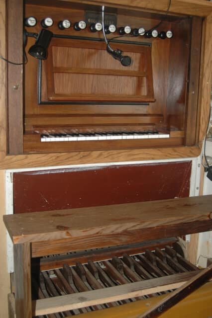 Stół gry wbudowany w lewy bok szafy organowej. 8 głosów podzielonych pomiędzy jeden manuał (7) o zakresie C-f3 i pedał (1) o zakresie C-h.