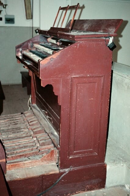 Stół gry wolnostojący, na osi prospektu, przodem do ołtarza głównego. 14 głosów podzielonych pomiędzy dwa manuały (I-7, II-4) o zakresie C-f3 i pedał (3) o zakresie C-c1.