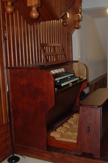 Stół gry wbudowany w lewą ściankę szafy organowej, bokiem do ołtarza głównego. 10 głosów podzielonych pomiędzy jeden manuał (7) o zakresie C-c3 i pedał (3) o zakresie C-c1.