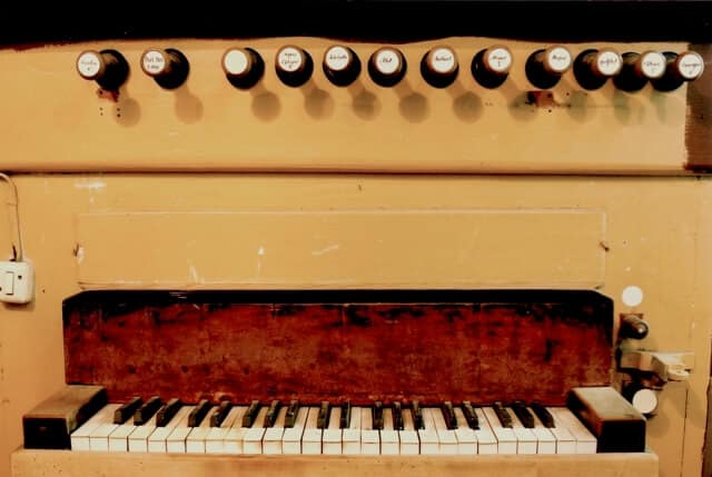 Stół gry wbudowany w lewy bok szafy organowej. 15 głosów podzielonych pomiędzy jeden manuał (12) o zakresie E-c3 (krótka oktawa przestawiona na układ chromatyczny) i pedał (3) o zakresie C-f.